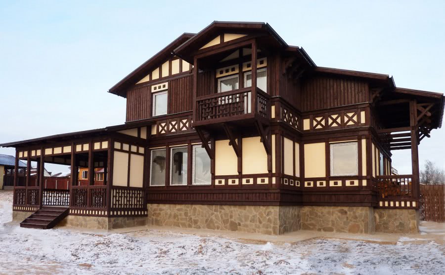 Выбор контрастных цветов. Внешний вид такой постройки будет ярким и запоминающимся. В основе цветового решения лежат два максимально контрастных цвета, например, шоколадно-коричневый для материала крыши и бледно-желтый или бежевый для фасада. Иногда для усиления эффекта детали фасада (двери, наличники, цоколь) также окрашиваются в тон крыше.