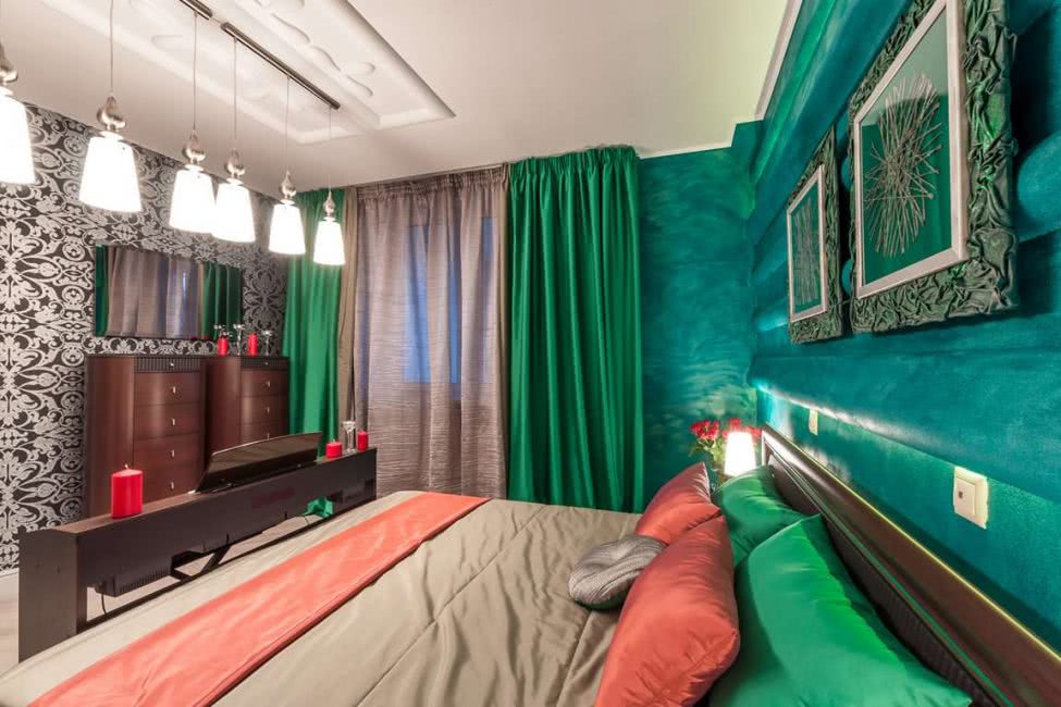 Если переборщить с зелеными тонами, то комната получится не уютной для сна. Она будет иметь мрачный вид и в результате неправильного сочетания красок. Чтобы этого не допустить в спальне нужно взять один основной тон.