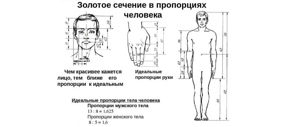 Пропорции различных частей нашего тела составляют число, очень близкое к золотому сечению. Если эти пропорции совпадают с формулой золотого сечения, то внешность или тело человека считается идеально сложенными. Принцип расчета золотой меры на теле человека можно изобразить в виде схемы: