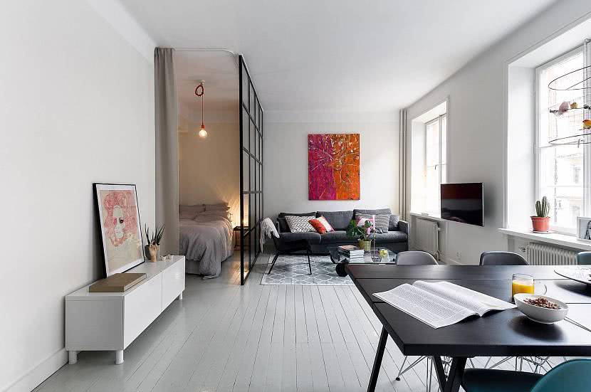 Выделение в одной комнате спального места и гостиной актуально для одиноких горожан со средним достатком. К совету дизайнера прислушается молодая семья в своей первой квартире-студии в новостройке. Или в однокомнатной хрущёвке, доставшейся от бабушки.