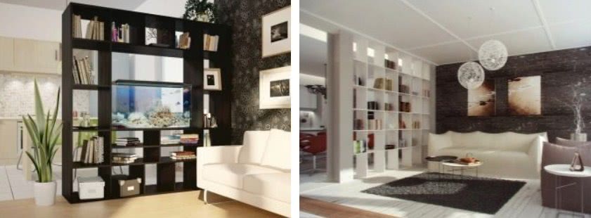 Для маленьких квартир дизайнеры разработали многофункциональные перегородки. Они играют роль стеллажей, служат подставкой для телевизора или цветов. Также здесь устанавливают аквариум.
